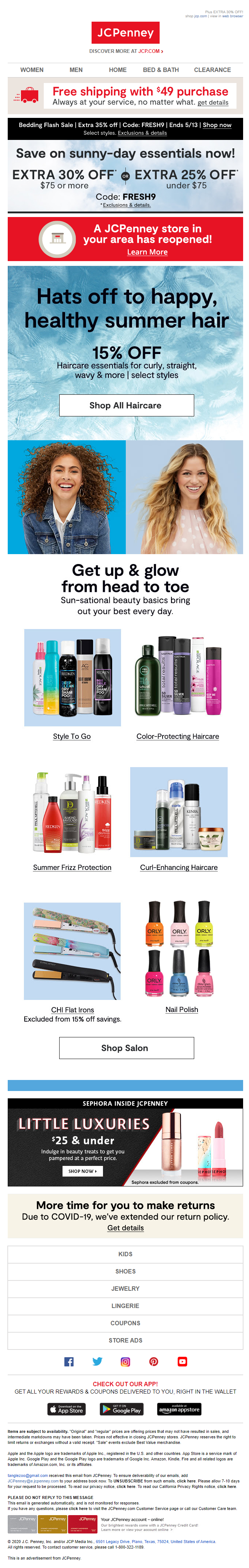 Salon focused email promoting summer essentials during quarantine. Contributions: layout design aligning with company brand standards for the summer season.